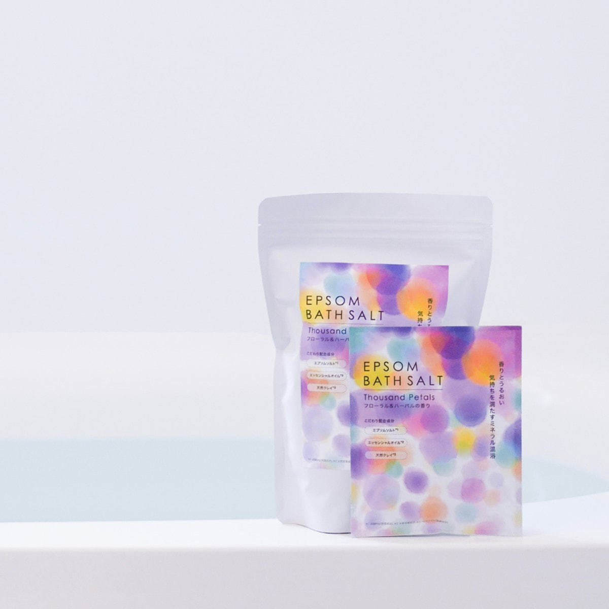 エプソムソルト(硫酸Mg(保湿成分))をメインに、エッセンシャルオイル(天然芳香成分)、天然クレイ(ベントナイト(吸着成分))を合わせました。